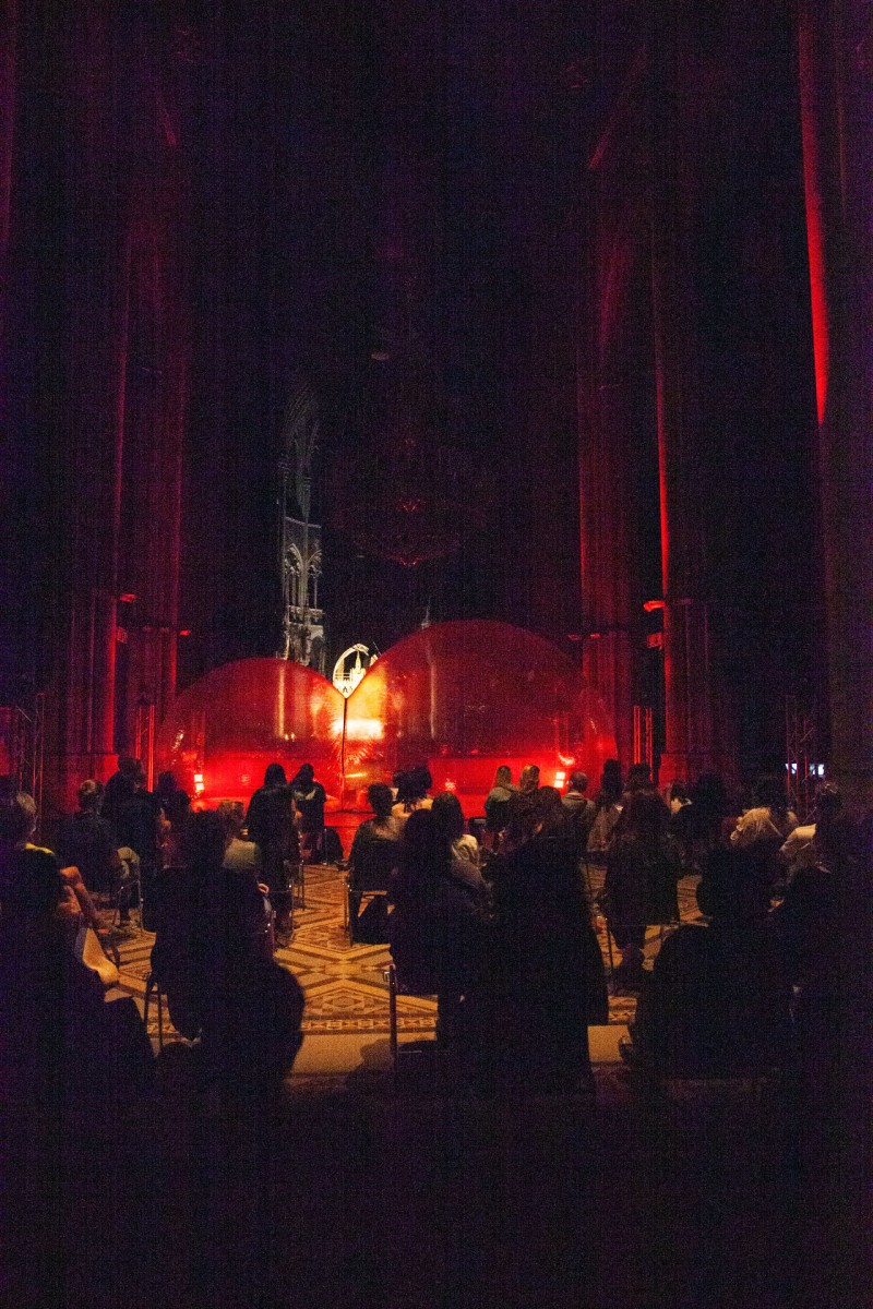 Thereby the live performance by Maque Pereyra and Mzamo Nondlwana meet the short film by Safira Moreira, May Irineu, Rajan Irineu, and Caique Mello. A plastic bubble located in Votivkirche gives the framework for the stage which is accompanied by an original C-AFROBRASIL soundtrack. The works are inspired by pleasure activism by Maree Brown.