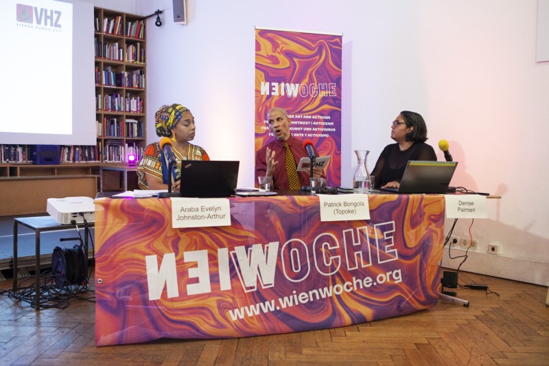 The podium discussion led by Araba Evelyn Johnston-Arthur and Topoke will focus on the Ritual - Procession - Performance VHZ 1896 - Legacies of the Healing in connection with the artistic work, research and practice that have unfolded in the preparation of this project hosted at WIENWOCHE 2023. They will also share their practice as artists and researchers around the thematic of Austria’s colonial past and the human Zoos.