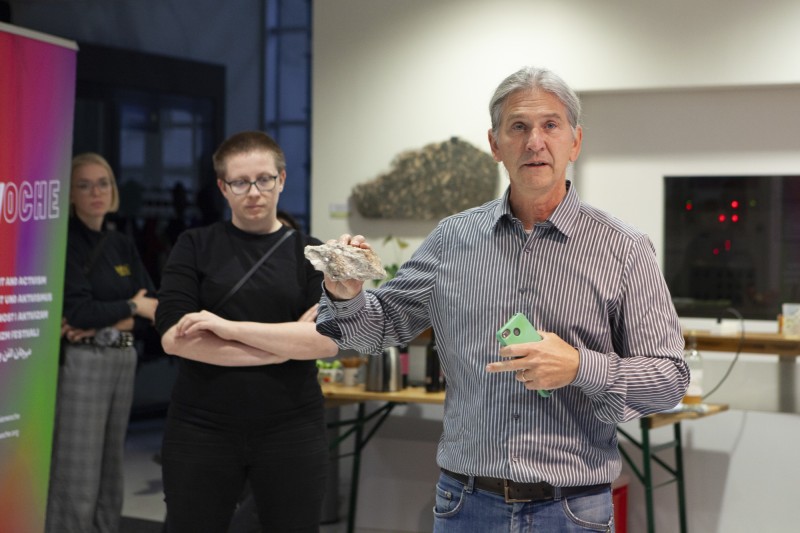 Eine Beziehung zu zerstörten und beschädigten Welten herstellend, blickt die Ausstellung darauf, wie Material bewegt, zerstoßen, zerkleinert und verwendet wird, um weiteres Material nutzbar zu machen. Sie stellt einen Raum zur Verfügung, um gemeinsam darüber nachzudenken, wie wir auf die komplexen Ökologien der mehr-als- menschlichen Gemeinschaften lithischer Arbeiten antworten können, während sich diese stets neu formieren zum Vorteil derer, die weit weg leben, nämlich hier.