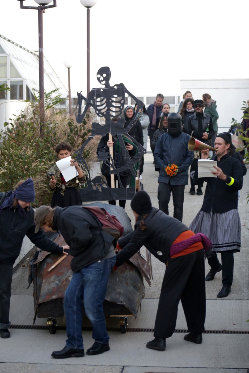 Immo Grief ist eine Baustelle für Trauerrituale. Gemeinsam bauen wir eine Unterkunft für unsere Ideen und unsere Zusammenkünfte, schauen Filme an, stellen aus, lesen, essen, denken über Verlust nach. So entsteht für einen kleinen Zeitabschnitt eine Zentrale für Immobilientrauer.