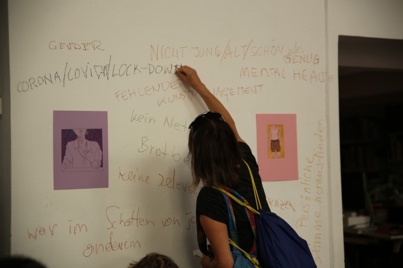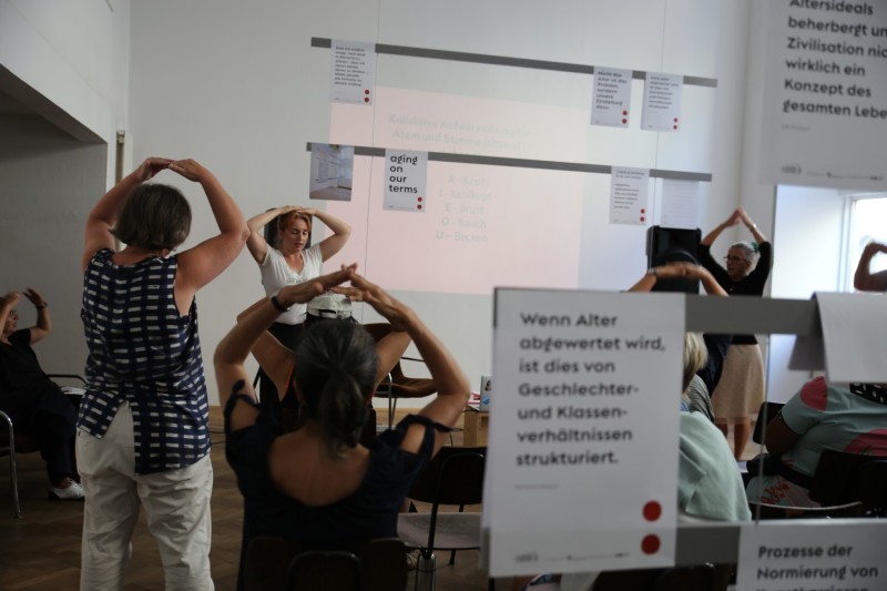Gerahmt wird die Veranstaltung von einer Ausstellung im Hauptraum der IG Bildende Kunst, welche verschiedene künstlerische Arbeiten zur sozialen Konstruktion des Alters versammelt. Sie speist sich aus den Beiträgen der am Aktionstag eingeladenen Künstler*innen, Archivar*innen und Multiplikator*innen, steht aber auch darüber hinaus als Labor offen.